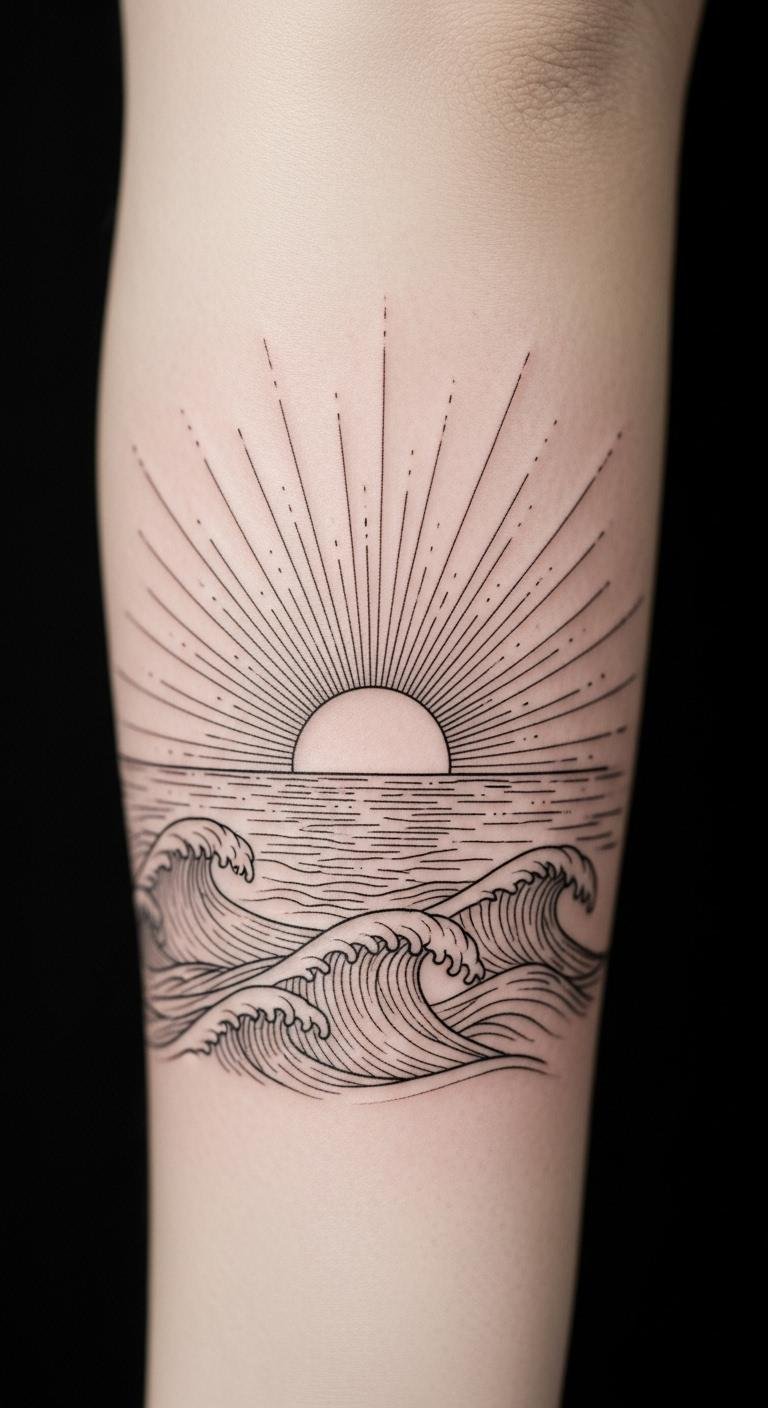 Sun sets in fine waves. Forearm makes it story-ready. Line it out with a ruler and pen. Fast prep. $100 for this look. Line specialists are ideal. Fine work is economical. Forearm displays easily. Sessions under an hour. Personalize the set for moments. It captures change. Test with drawn lines on skin; free. Healing: apply lotion daily. Match with bracelets.