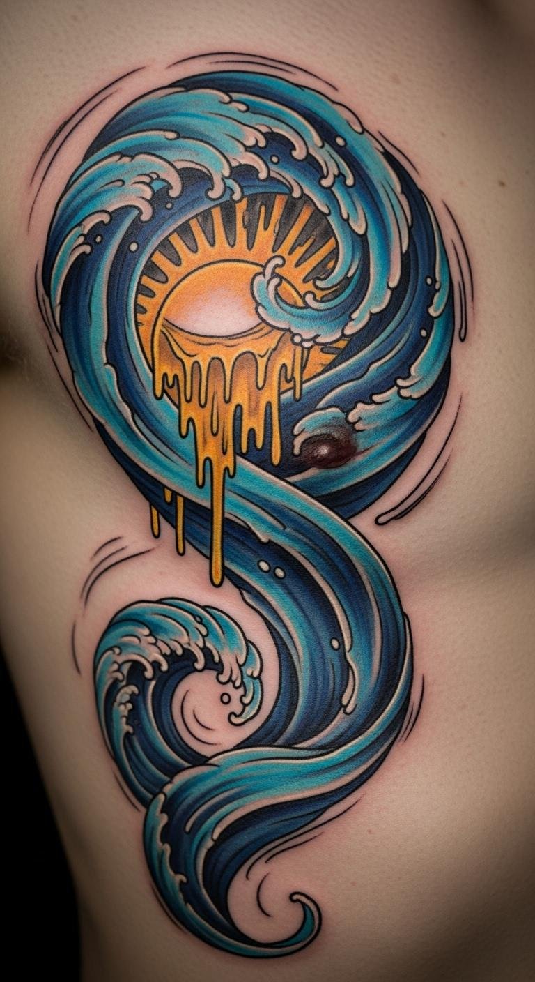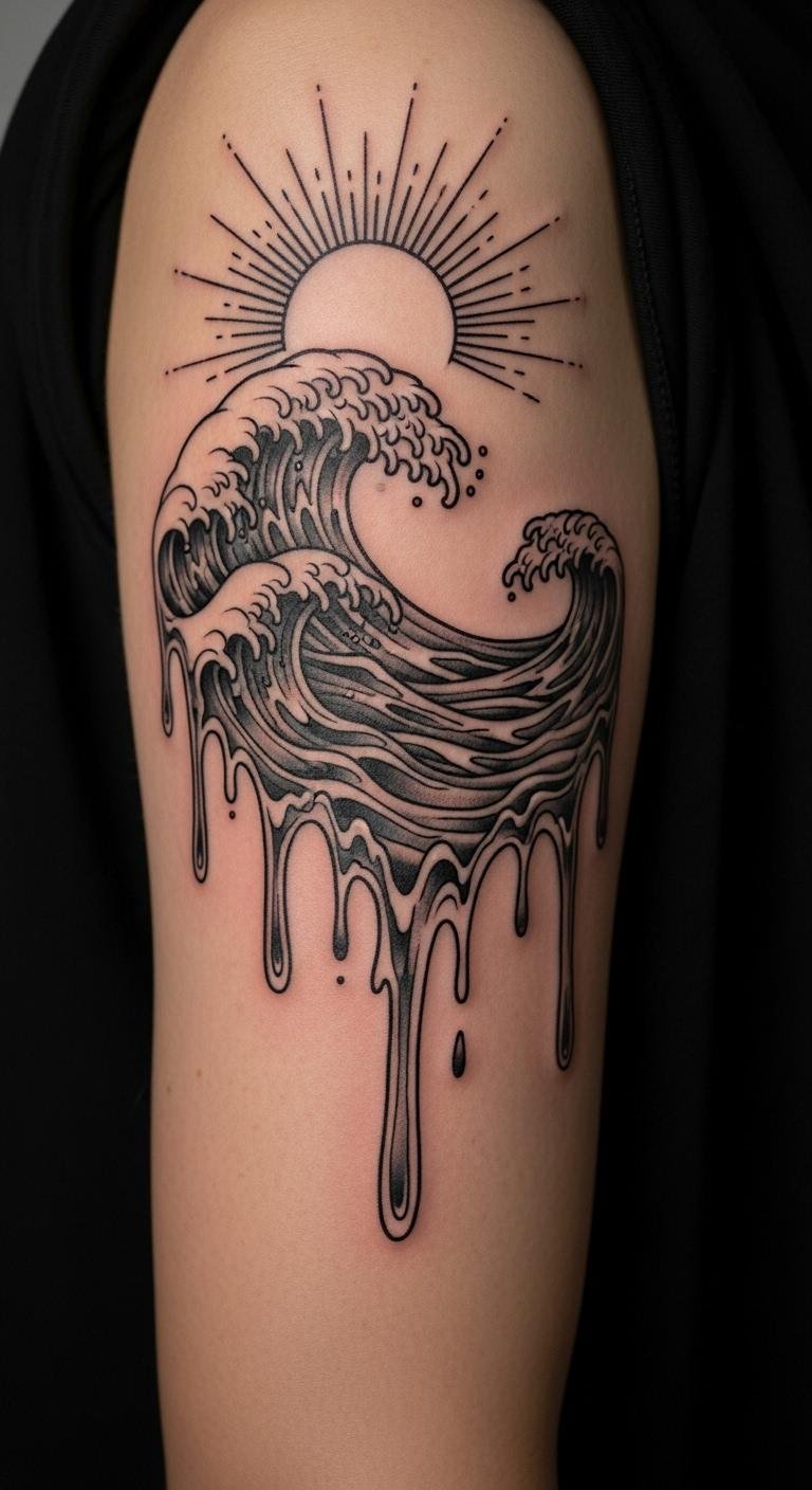 Waves melt into sun drama. Upper arm holds the scene. Drip designs with melted wax on paper. Creative start. $140 from artists. Melting masters do wonders. Simple drips save money. Arm view is versatile. 45-minute ink time. Add sun melts for you. It means flux. Use wax crayons for trials; low cost. Healing: avoid sweat. Flaunt in tees.