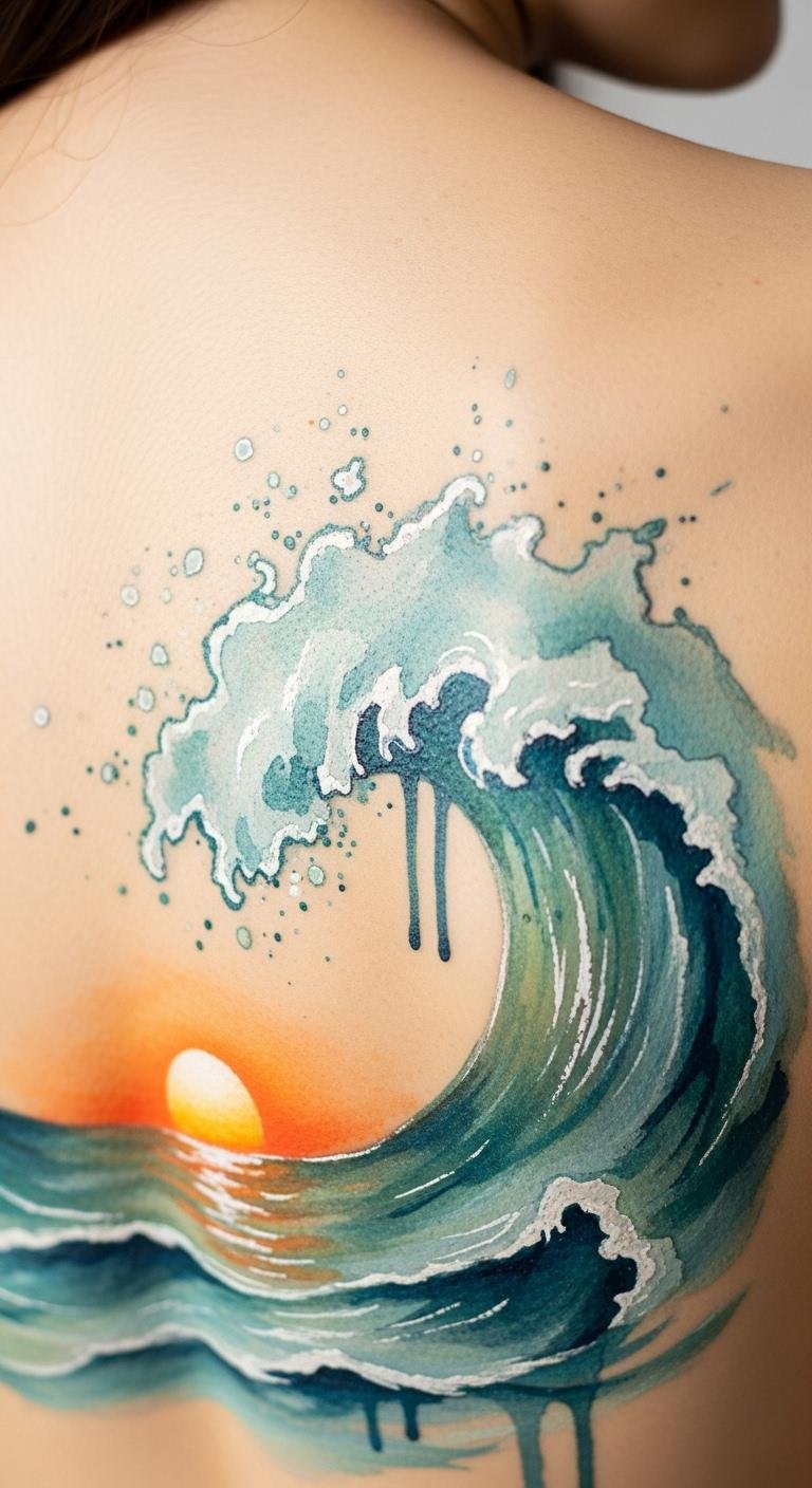 Spray waves in watercolor sun. Lower back frames it. Paint sprays on paper. Fun start. $160 total. Watercolor experts rock. Basic sprays cut costs. Back space is intimate. One-hour sessions. Personalize sprays for journeys. It means refresh. Practice with watercolors at home; inexpensive. Healing: soft fabrics only. Accent with backless tops.
