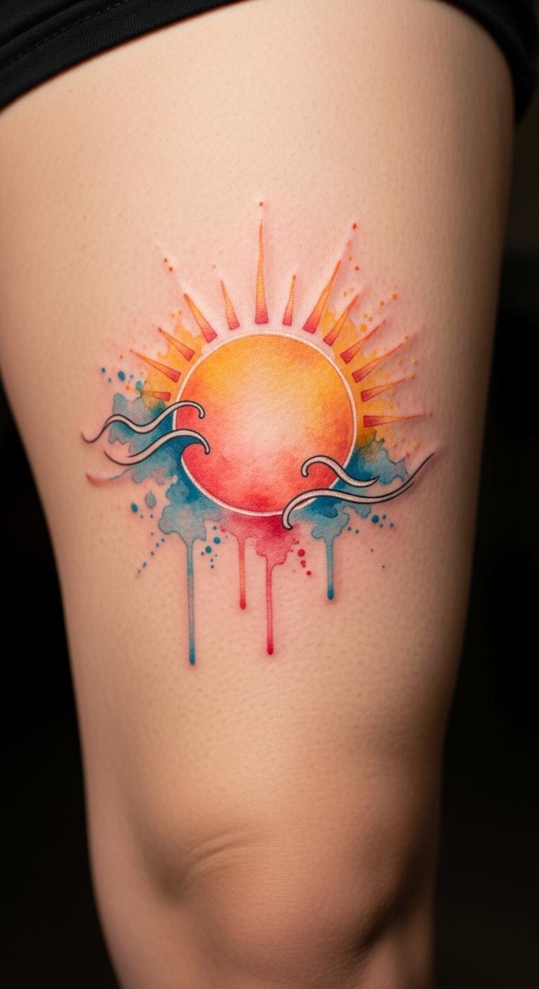 Watercolor brings soft waves alive. Thigh space lets it flow big. Blend colors on paper with water paints. It’s an easy start. Artists price this at $180. Find watercolor specialists. Limit hues for affordability. Thigh area shows when you want. One-hour sessions work well. Add wave splashes for personal flair. This design evokes energy. Test with washable paints on skin; costs nothing extra. Healing: avoid tight pants. Enjoy with swimwear vibes.