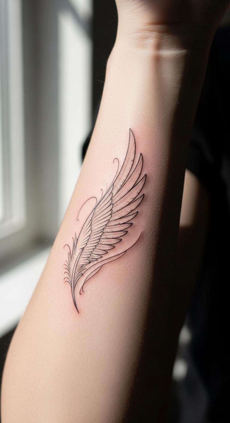 Minimalist wings keep things clean and easy. They use just a few lines for a feather effect. Place them on your wrist for daily wear. Draw inspiration from bird photos you find online. Try a DIY template with pen and paper. This way, you plan without spending extra. Budget tip: Use affordable ink sets from craft stores for practice drawings. Aim for designs under 2 inches to save on artist fees. They might cost around $50. Break the process into steps. Sketch first, then refine. This helps beginners feel confident. Add a twist like a curved tip for your story. After getting it, protect with sunscreen daily. It’s perfect for first-timers seeking low-key style.