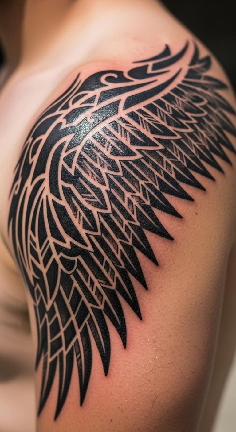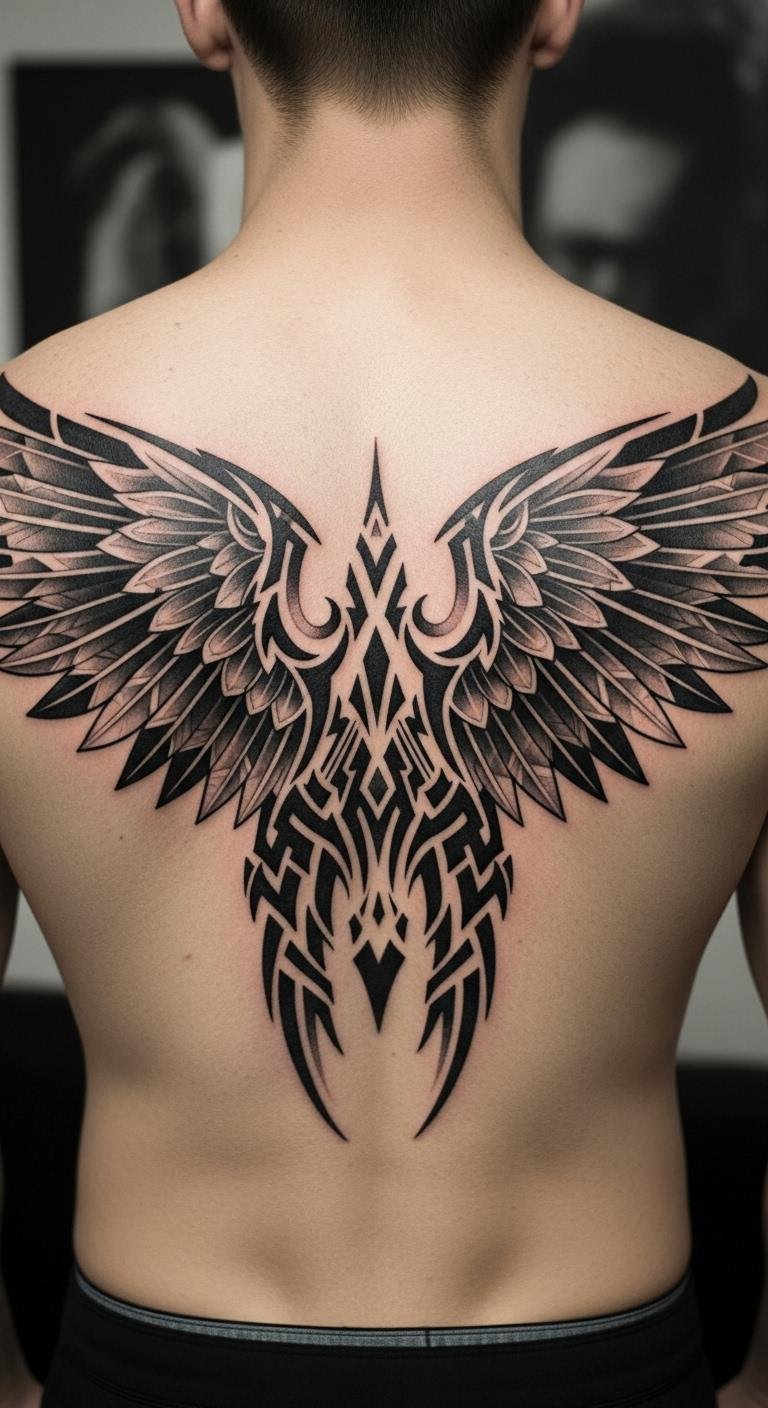 Tribal wings bring bold energy with sharp edges. They mix ancient vibes into modern ink. Focus on patterns that wrap around your arm. Look at free tribal art online for ideas. Create your own by combining shapes on a notebook. This is a cheap way to start. Budget advice: Find artists who offer flash designs for less than $80. Keep sizes small to cut costs. Use a marker to test the look on your skin first. It lets you adjust easily. For a DIY feel, add dots or lines yourself in sketches. Apply a basic lotion post-tattoo to maintain it. This design works for anyone wanting edge without complexity.