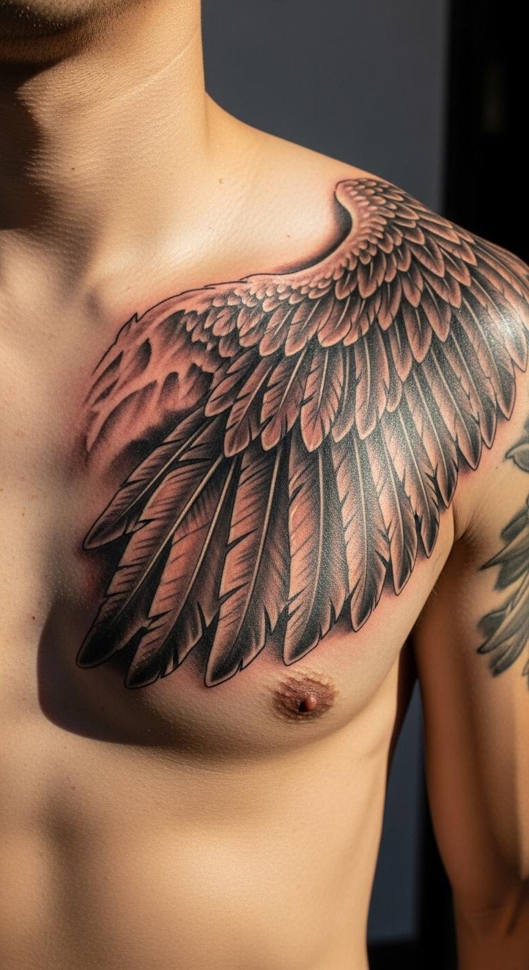 Chest wings make a statement with size. They cover boldly. Sketch on chest shapes. Easy prep. Budget options at $100. Layer designs. Mock with drawings. Protect with care. For confident wear.