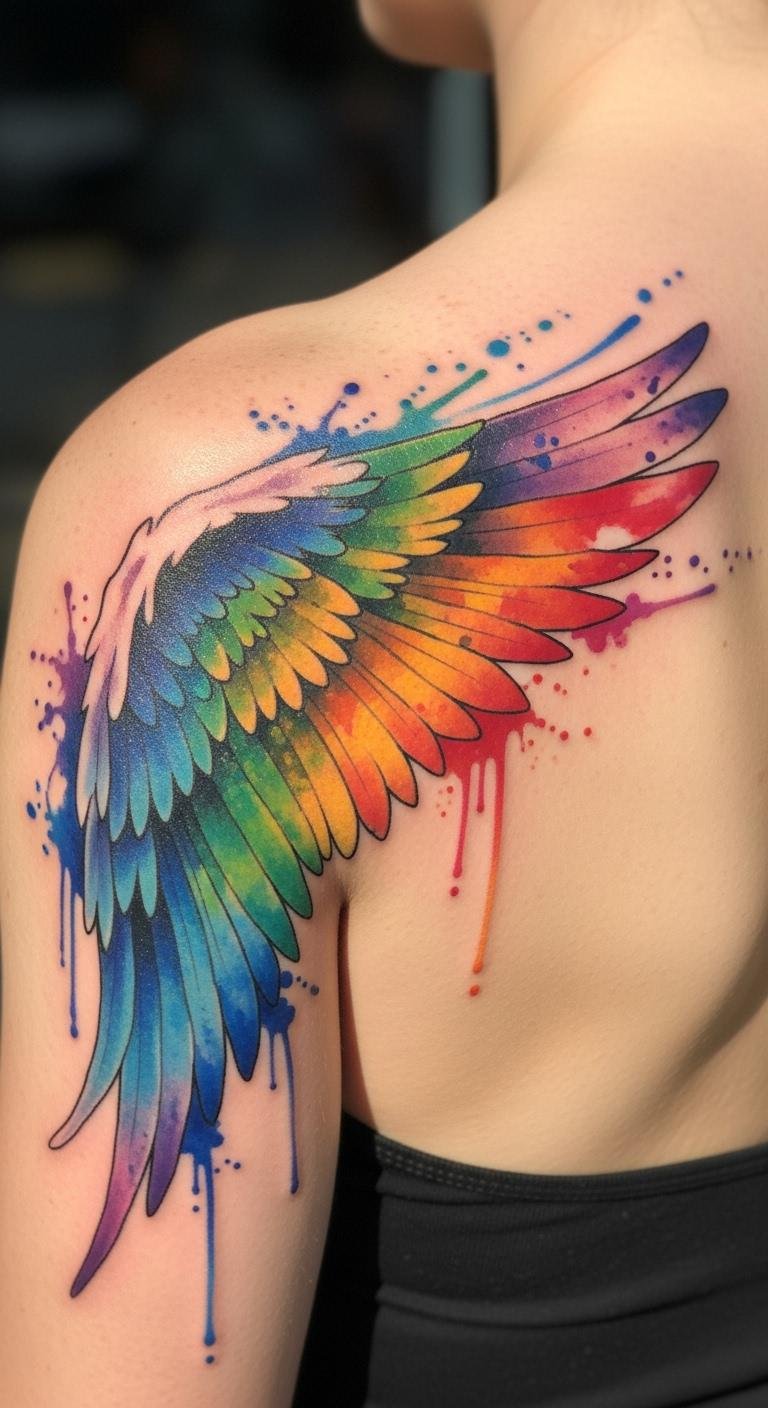 Watercolor wings use bright colors for vibrancy. They create a painted feel with ease. Pull colors from your favorite art. Sketch with colored pencils first. It’s budget-friendly fun. Opt for small areas, costing $50. Blend shades in your designs. Practice on fabric scraps. Moisturize regularly after. Ideal for creative types.