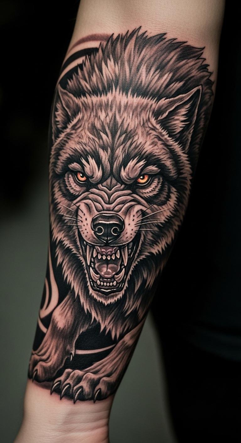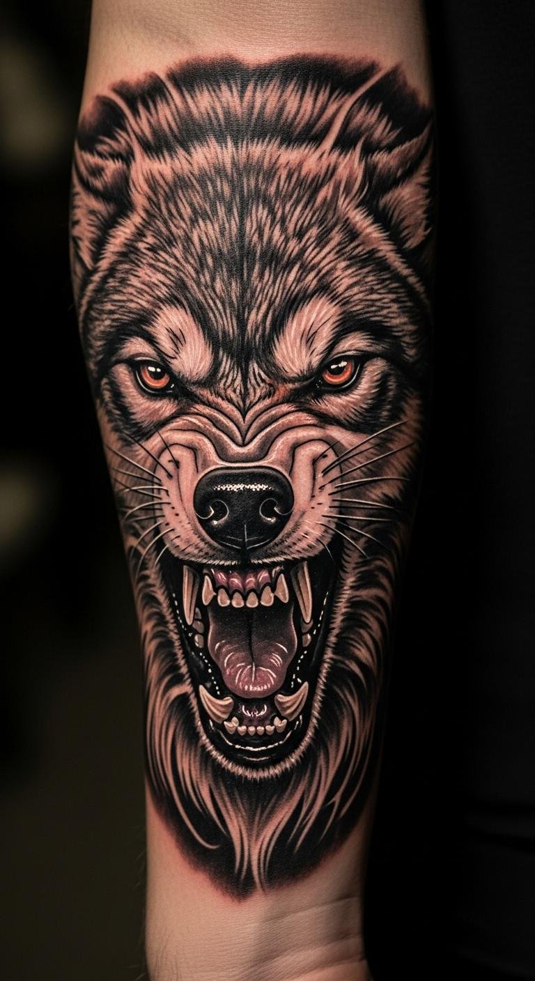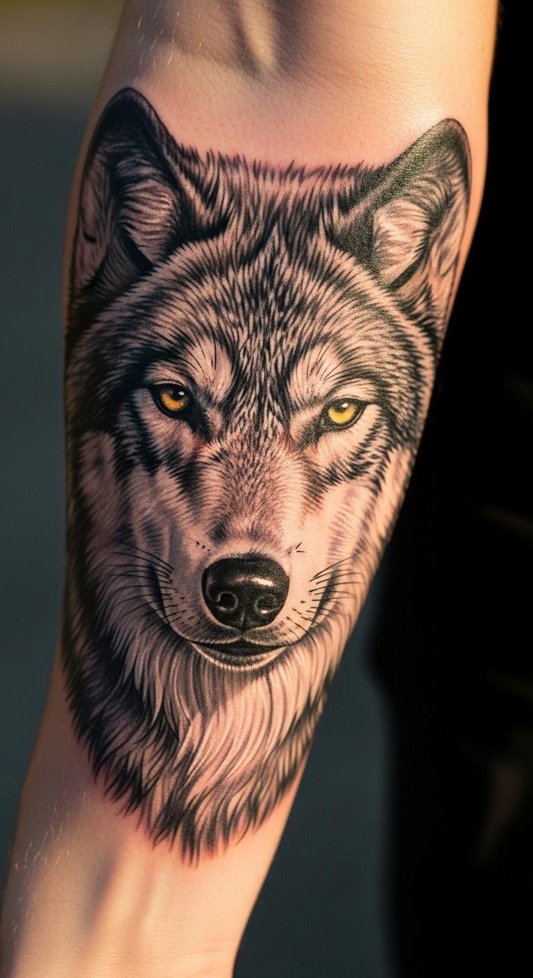 Bold wolf face dominates your forearm. Fierce expressions make it commanding. This design demands notice. Use strong lines for value. Draw faces with bold markers. Digital edits refine looks. Center on the arm front. Shops have package rates. Include eye highlights. This tattoo enhances bold outfits. It projects power directly.