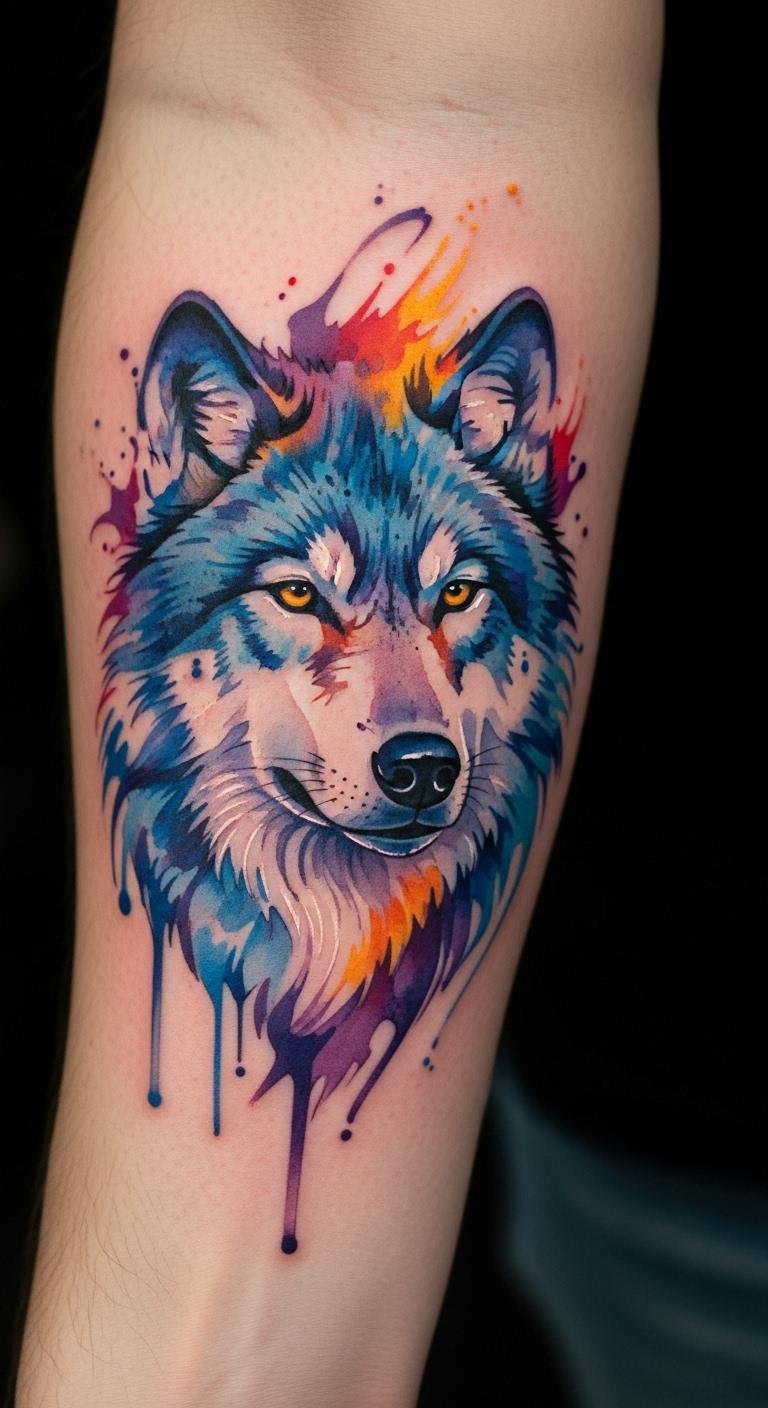 Watercolor wolf brings color splashes to your forearm. Soft blends create a fluid effect. It’s artistic and fun. Limit colors for budget ease. Experiment with water paints at home. Online guides show blending tricks. Position on the arm for flow. Artists might mix in free sessions. Include a color accent. This design brightens daily wear. It adds vibrancy effortlessly.