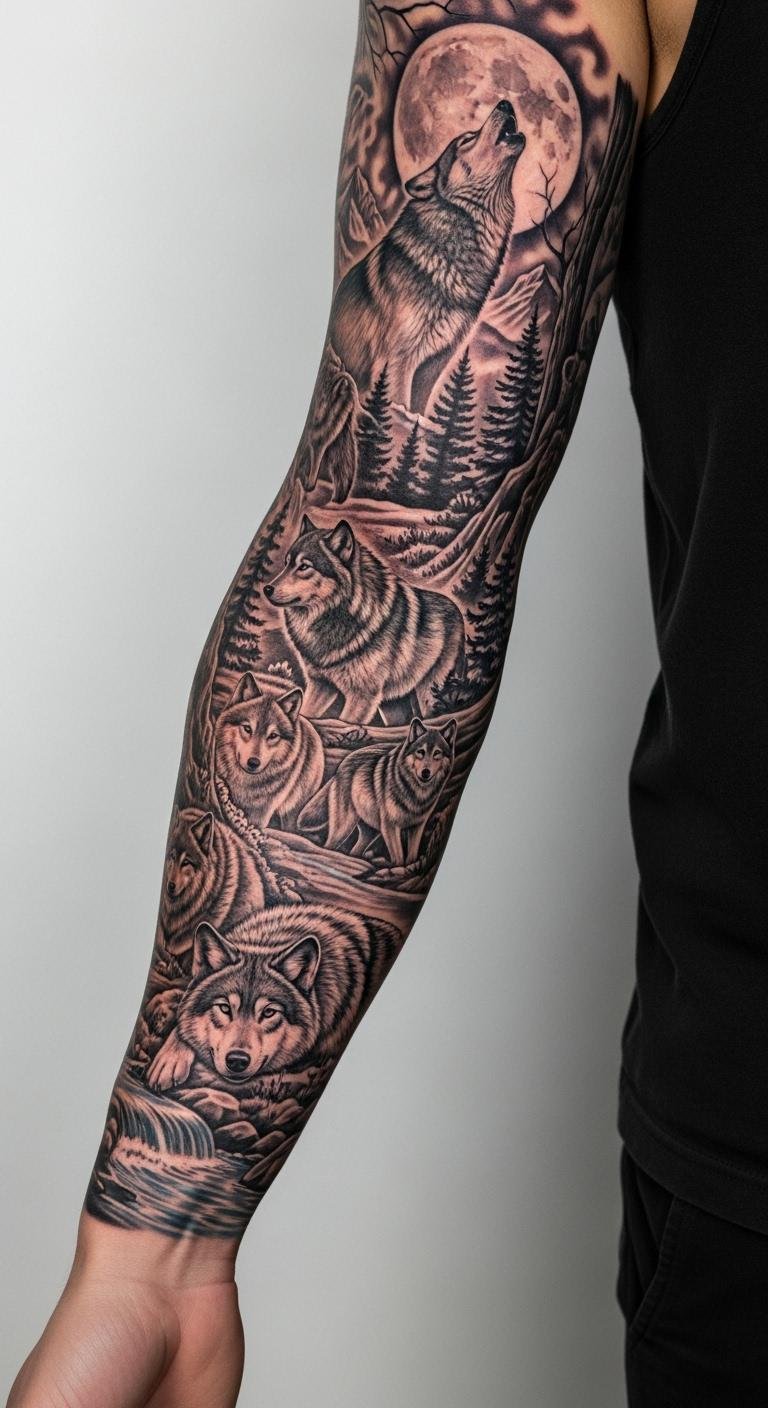 Half-sleeve wolf spreads across your forearm. It builds a larger story with ease. This option feels expansive. Break it into phases for savings. Plan sections with home drawings. Digital previews help visualize. Start from the wrist up. Artists often stage payments. Add story layers gradually. This tattoo stands out in groups. It creates a narrative flow.