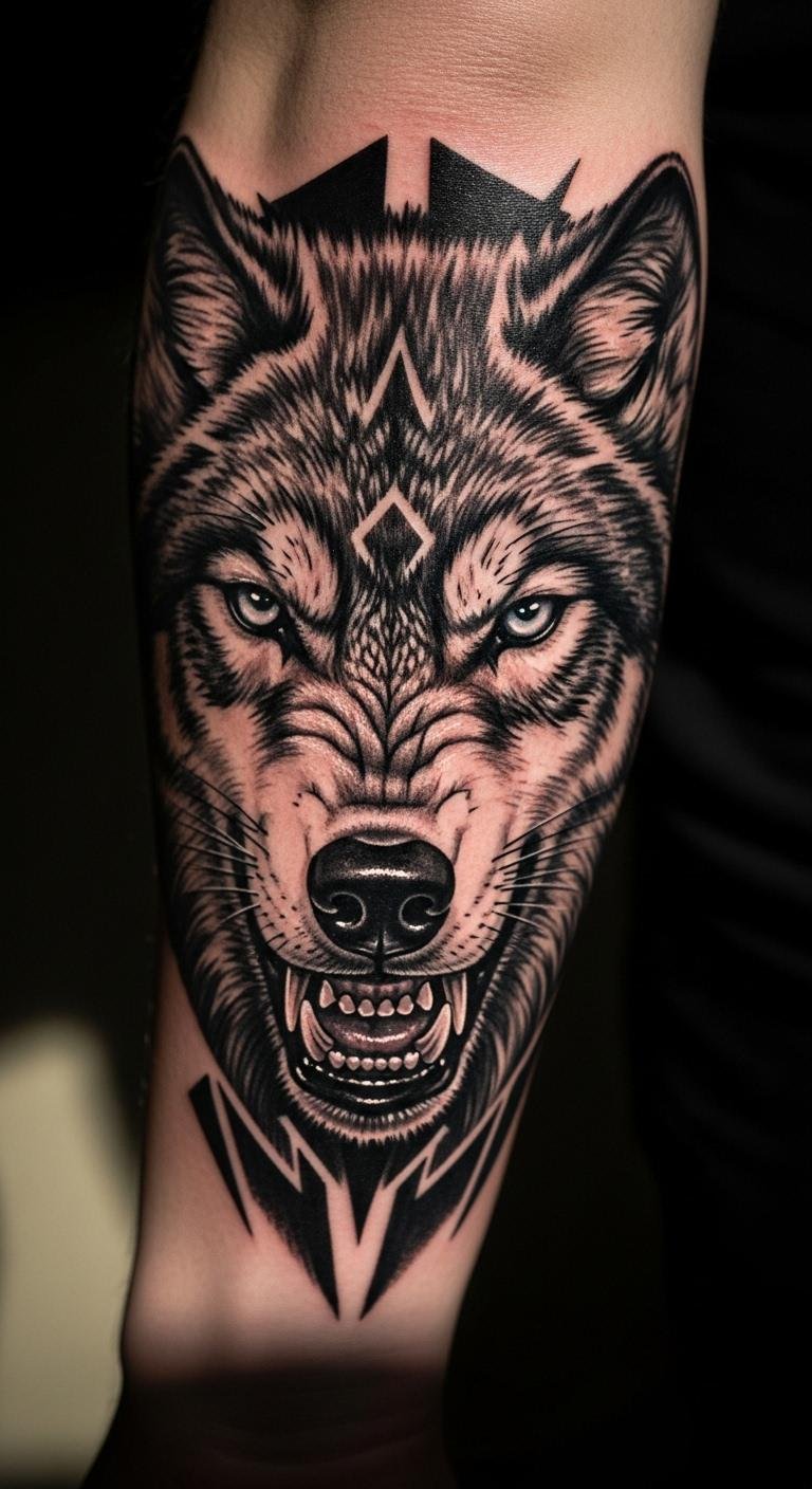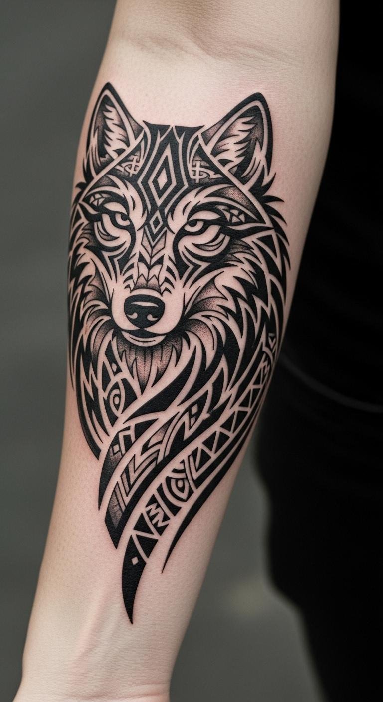 Tribal wolf designs mix sharp lines and shapes on your forearm. They draw from old traditions for a strong vibe. Bold patterns create a modern edge. Opt for black ink only to cut costs. As a tip, draw simple shapes with a ruler at home for a DIY preview. Free apps let you overlay designs on photos of your arm. Place it along the muscle for balance. Find artists who specialize in basics to keep it cheap. Add a small arrow for personalization. This tattoo pairs with casual clothes. It represents protection in a cool way.