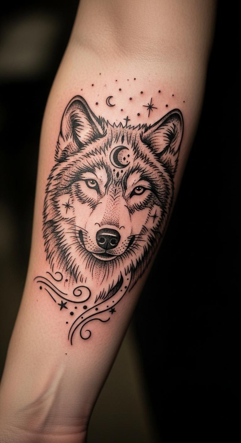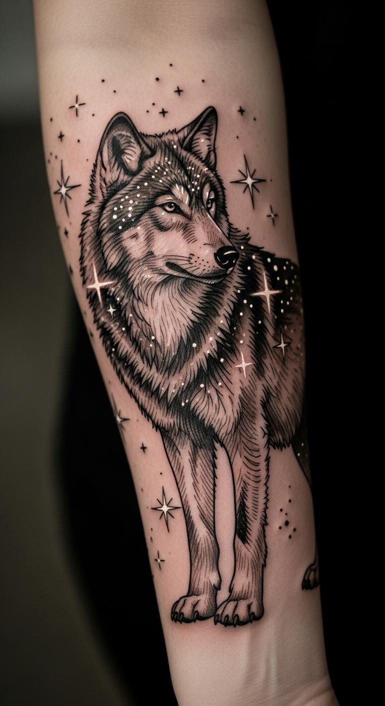 Mystical wolf with stars brings magic to your forearm. Dots create a cosmic vibe. It’s enchanting and easy. Opt for dot work to cut costs. Poke stars with a pin at home. Celestial tools online guide. Scatter on the arm. Artists price per dot. Include a star cluster. This tattoo glows at night. It adds wonder simply.