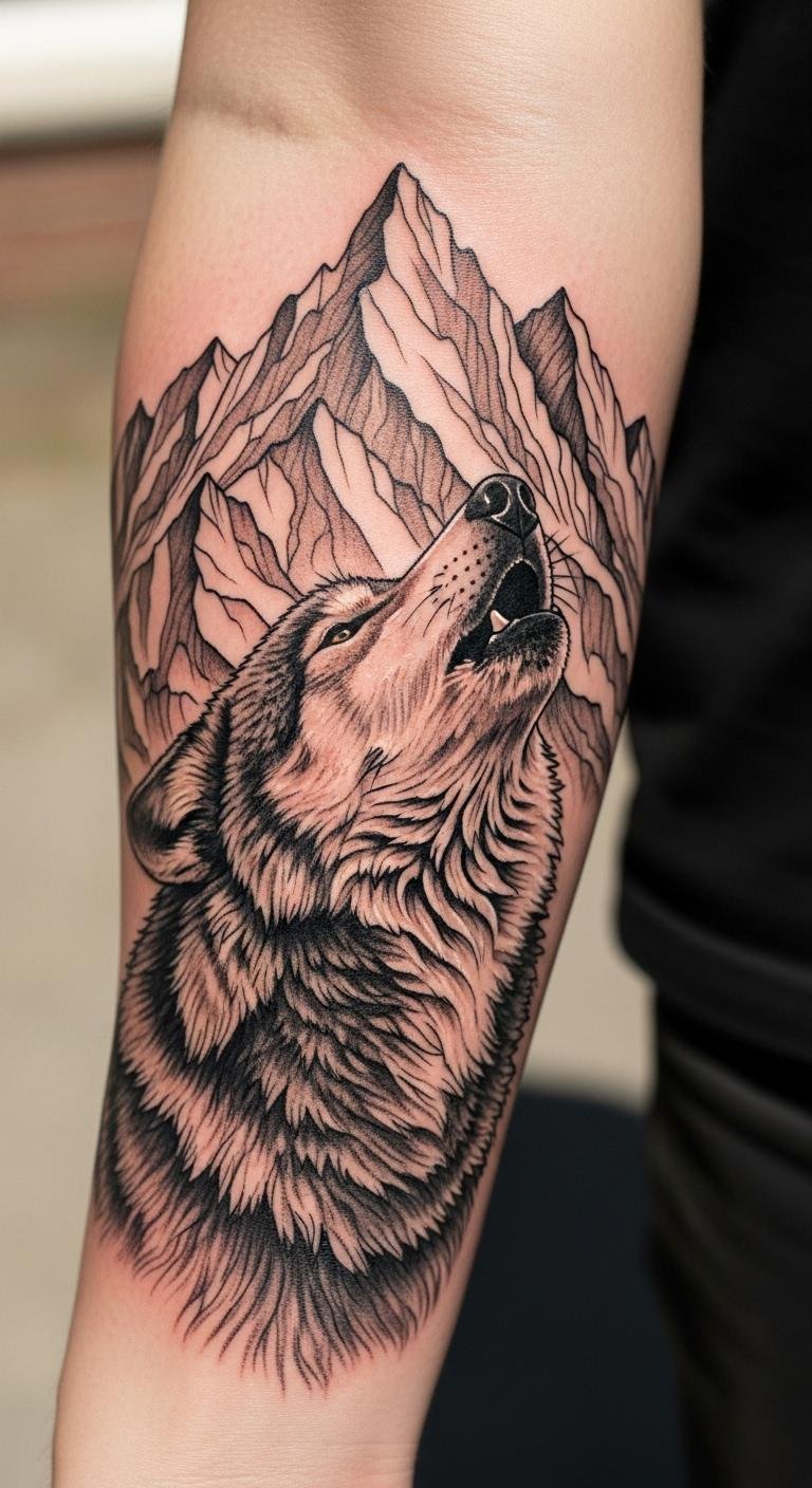 Wolf in mountains places adventure on your forearm. Peaks add a rugged feel. This design inspires. Use hill shapes to save. Sketch scenes with pastels. Nature apps provide layouts. Build up the arm. Shops bundle landscapes. Add a mountain peak. This tattoo suits trips. It captures wild essence.