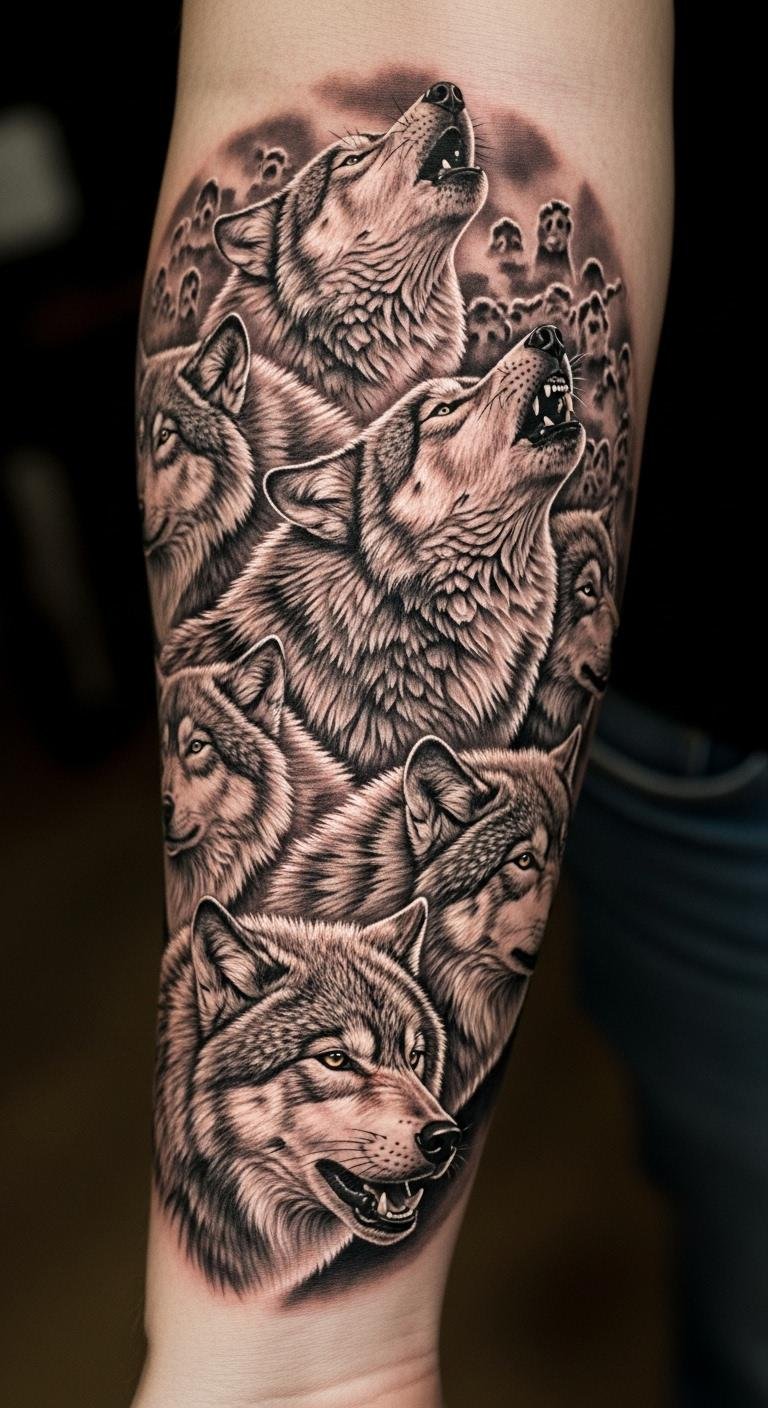 Detailed wolf pack shows multiple figures on your forearm. Realistic fur makes it vivid. This one builds community. Layer details gradually for budget. Draw groups with fine tips. Pack templates online help. Arrange on the arm. Artists phase in elements. Include pack dynamics. This tattoo strengthens ties. It portrays unity.