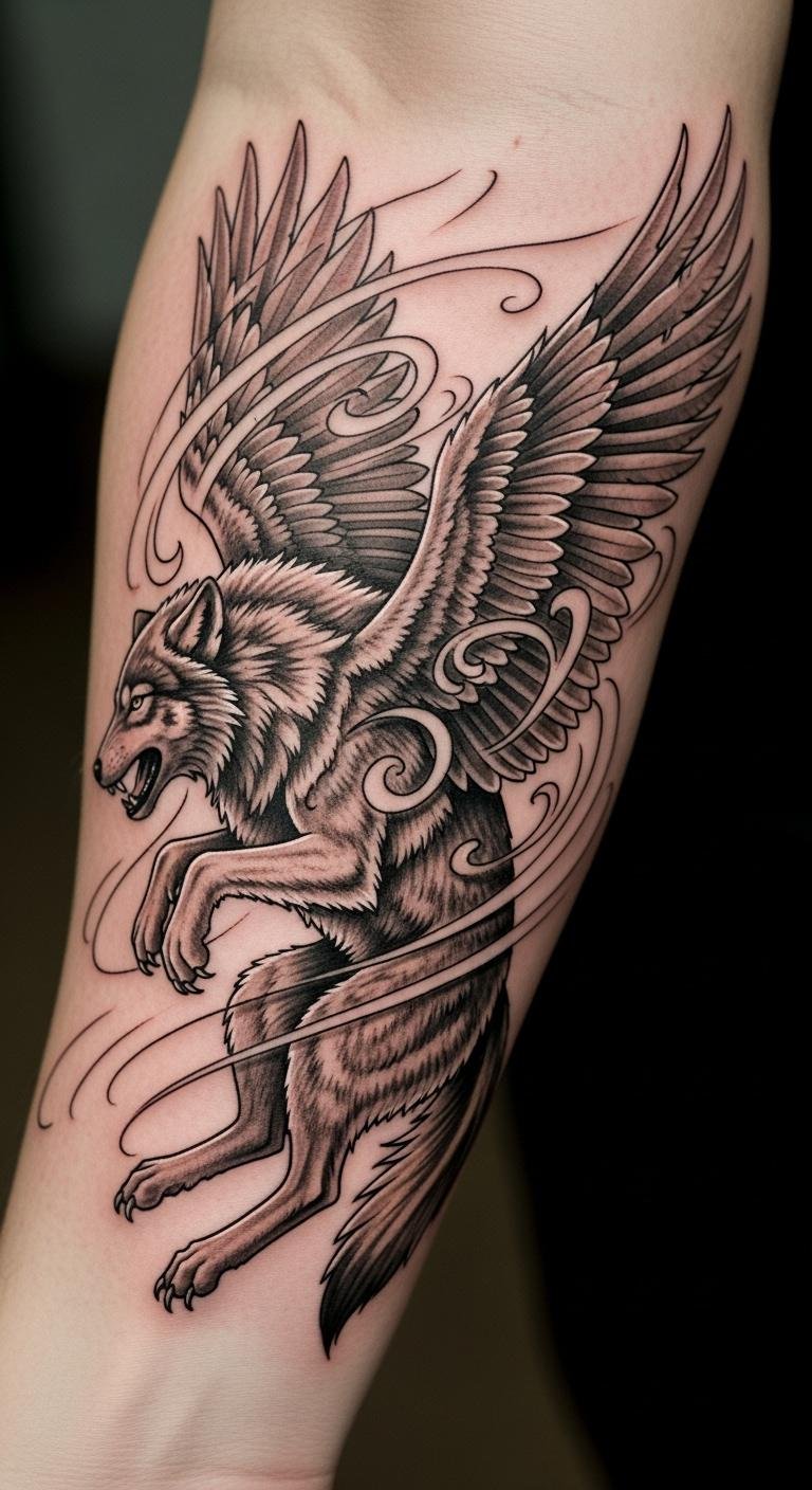 Freedom wolf in flight suggests motion on your forearm. Wind lines add liberty. This design lifts spirits. Go for flow lines to cut costs. Wave arms with drawings. Flight apps simulate. Extend along the arm. Artists blend motion. Include a wind swirl. This tattoo sparks freedom. It captures the thrill.