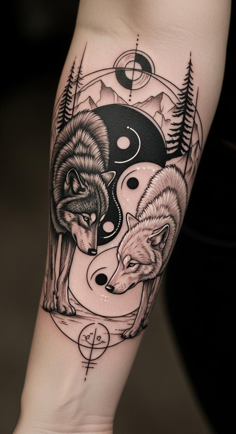 Balanced wolf harmony centers symmetry on your forearm. Even poses create peace. This one promotes calm. Use mirror lines for savings. Fold paper for symmetry at home. Balance tools online guide. Center on the arm. Shops mirror designs. Add a harmony mark. This tattoo soothes daily life. It fosters inner balance.