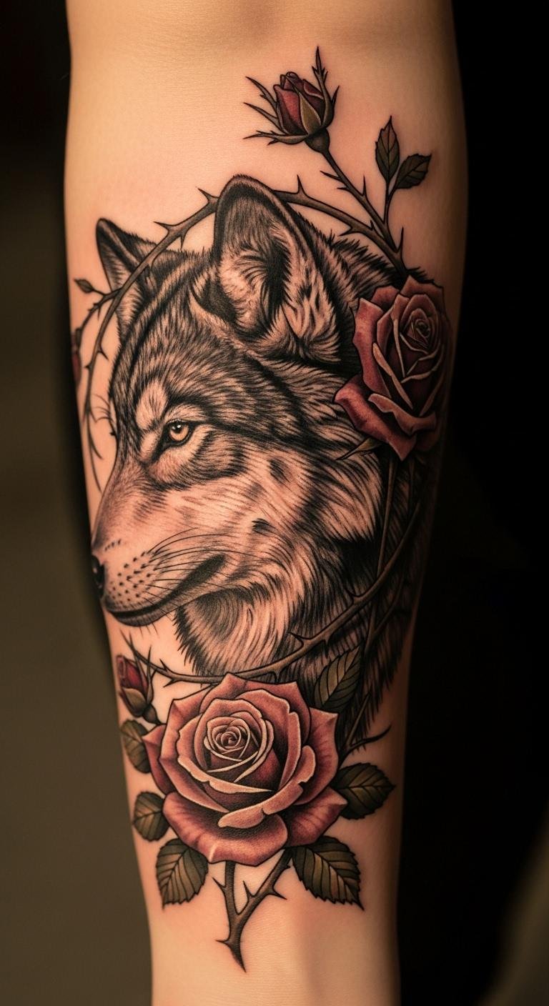 A wolf with a rose mixes toughness and beauty on your forearm. The flower adds a soft contrast to the fierce wolf. It tells a story of balance. Use fewer details to keep costs low. Draw both elements on paper as a fun DIY start. Free templates online mix the shapes. Place it midway on the arm for flow. Shops often discount combined designs. Add a thorn for personal flair. This tattoo enhances casual looks. It represents inner duality simply.