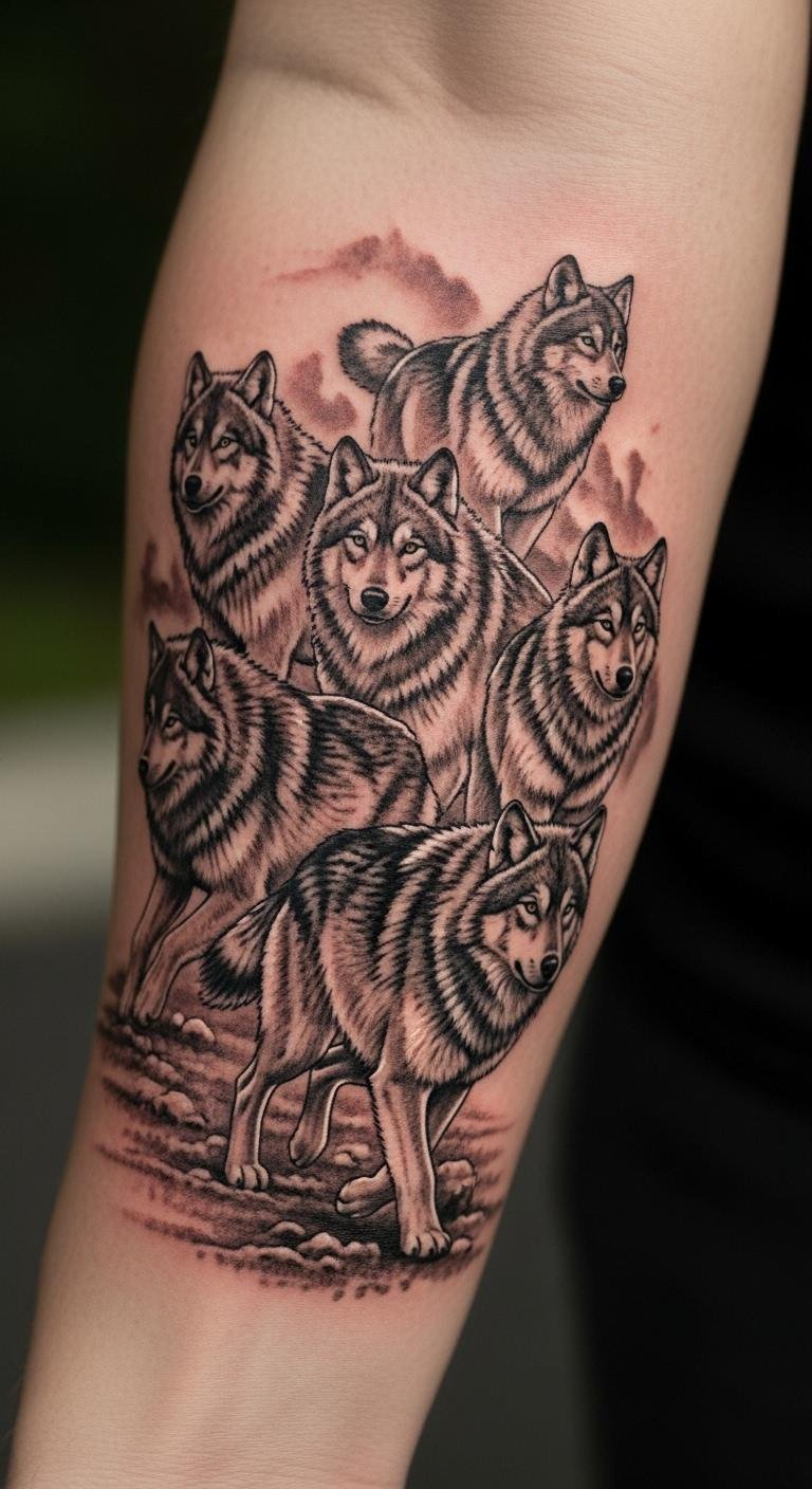 A wolf pack tattoo groups figures on your forearm. It stands for family ties and unity. Simple forms make it approachable. Choose group lines to save money. Arrange cutouts on your arm as a DIY test. Online resources offer pack layouts. Position them in a band for cohesion. Local artists might bundle designs. Add a leader wolf for depth. This tattoo suits social gatherings. It highlights bonds in a clear way.