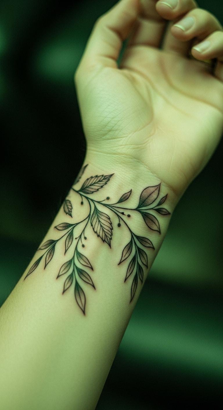 Leaves bring nature to your wrist. Sketch leaves on paper to begin. Use leaves from outside as guides. No cost involved. Tattoos like this for $75. Opt for outlines. Place along the edge for flow. They signify renewal. Use home oils for care. Keep protected. These designs spark peace. Practice with real leaves pressed on.