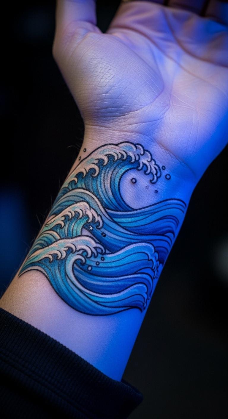 Waves create calm on your wrist. Draw waves on paper first. Use curves freely. Free activity. Water designs at $70. Go for simple flows. Position on the curve for movement. They represent peace. Use home moisturizers. Keep out of water. These tattoos promote tranquility. Practice with water drawings.