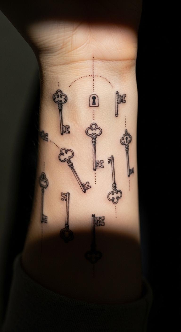 Keys unlock possibilities on your wrist. Draw keys on paper first. Add teeth details. Free to do. Keys for $50. Keep simple. Position for access. They mean new doors. Use home care items. Protect daily. These designs open paths. Practice with key sketches.