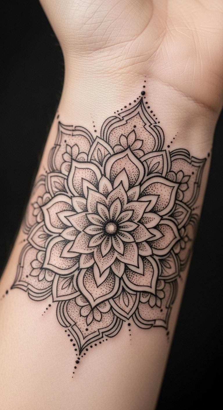 A mandala on your wrist means balance and peace. Draw circles and shapes on paper to start. It’s a free way to experiment. Look for simple versions at budget studios, maybe $80. Use basic tools like a compass for your sketch. Place it on the outer wrist for visibility. The patterns create harmony. Choose black outlines for longevity. Heal with petroleum jelly you already have. Keep it dry for days. These designs foster inner strength. Test with a sticker tattoo first. It sticks and peels easily. Focus on even lines for the best look.