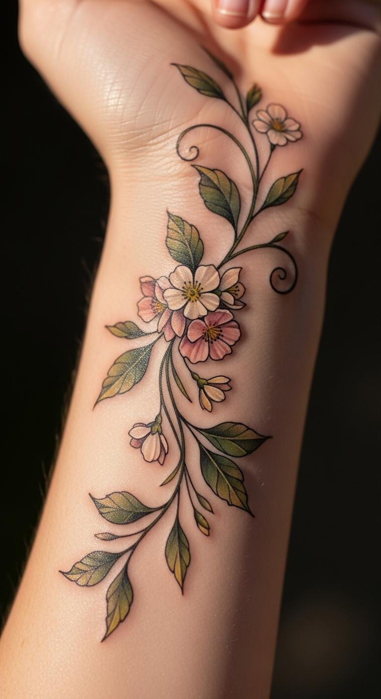 Vines with flowers add a natural flow. Sketch vines on paper to plan. Add leaves with crayons. It’s free fun. Simple tattoos cost around $90. Choose fewer elements. Place on the inner side for subtlety. They mean growth. Use household cream for healing. Protect from water. These accents empower change. Practice with string on your arm. Tie and untie easily.