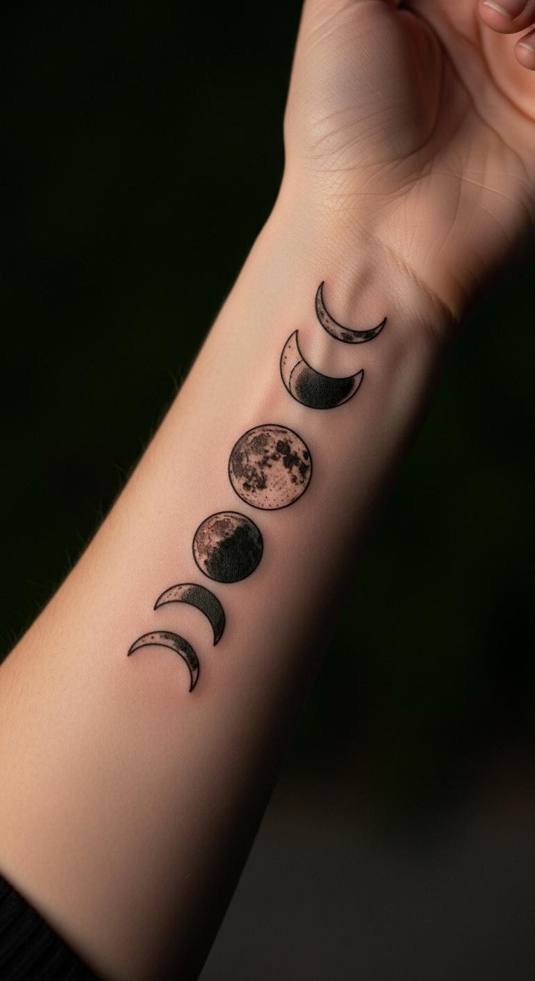 Moon phases track your journey. Draw phases on a sheet first. Use circles to outline. Quick and cost-free. Artists offer for about $65. Keep it minimal. Position on the wrist bone for meaning. They connect to cycles. Heal with basic salves from home. Avoid direct sun. These tattoos encourage reflection. Try with moon stickers. Stick on and remove.